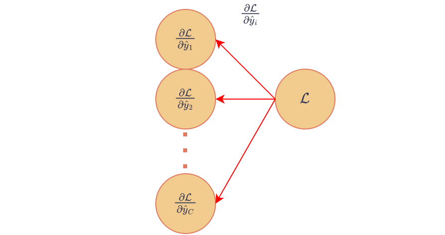 After computing loss, we can start computing gradients with respect to it. Since there are $C$ classes, we need to calculate derivative of each prediction $\hat{y}_i$: