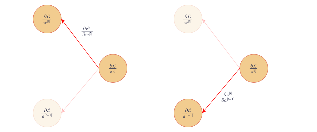 $$ \frac{\partial \mathcal{L}}{\partial A^{[l-1]}} = \frac{\partial \mathcal{L}}{\partial Z^{[l]}} \frac{\partial Z^{[l]}}{\partial A^{[l-1]}} $$