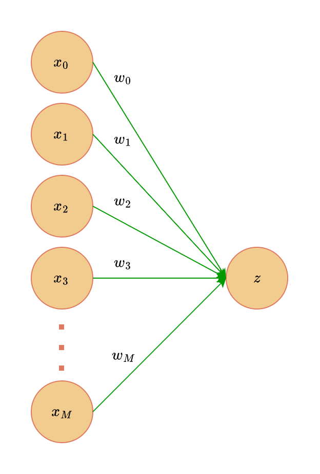 $$ z = w_1 \cdot x_1 + w_2 \cdot x_2 + \dots + w_M \cdot x_M + b $$