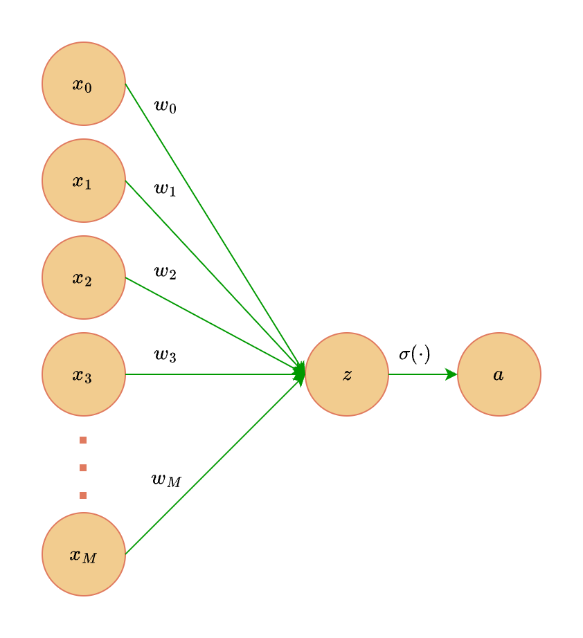$$ \underbrace{a}_{[C \times 1]} = \sigma \left( \underbrace{W}_{[C \times (M+1)]} \quad \underbrace{x}_{[(M+1) \times 1]} \right) $$