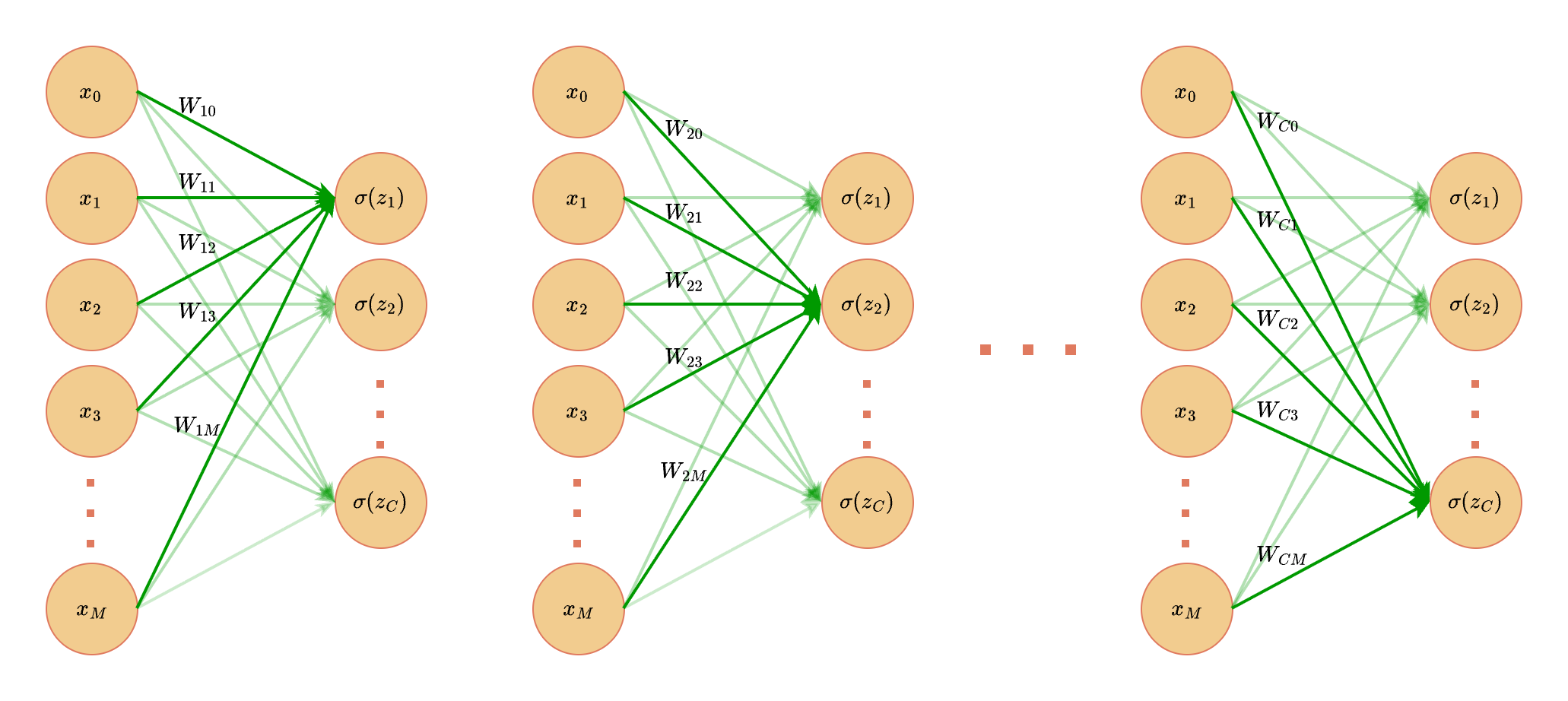 $$ \begin{bmatrix} a_{1} \\ a_{2} \\ \vdots \\ a_{C} \end{bmatrix} = \sigma \left( \begin{bmatrix} W_{10} & W_{11} & W_{12} & \dots & W_{1M} \\ W_{20} & W_{21} & W_{22} & \dots & W_{2M} \\ \vdots & \vdots & \vdots & \ddots & \vdots \\ W_{C0} & W_{C1} & W_{C2} & \dots & W_{CM} \end{bmatrix} \begin{bmatrix} x_{0} \\ x_{1} \\ x_{2} \\ \vdots \\ x_{M} \end{bmatrix} \right) $$