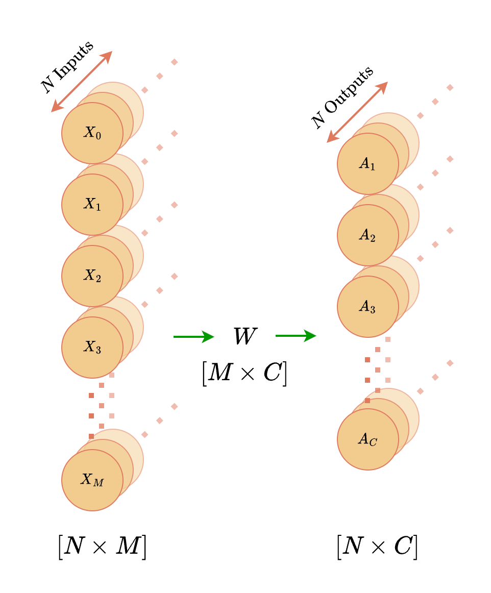 $$ \underbrace{A}_{[N \times C]} = \sigma\left(\underbrace{X}_{[N \times (M+1)]} \quad \underbrace{W}_{[(M+1) \times C]}\right) $$