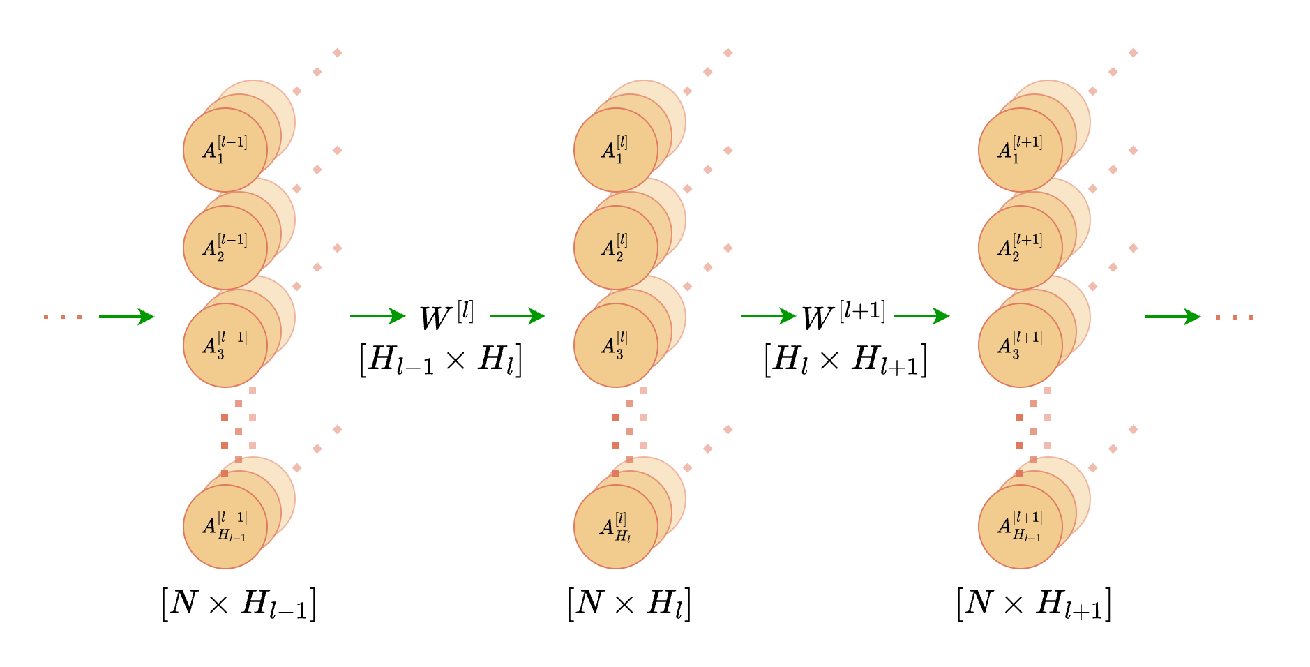$$ \begin{align*} \underbrace{Z^{[l]}}_{[N \times H_{l}]} &= \underbrace{A^{[l-1]}}_{[N \times H_{l-1}]} \quad \underbrace{W^{[l]}}_{[H_{l-1} \times H_{l}]} \\ \underbrace{A^{[l]}}_{[N \times H_{l}]} &= \underbrace{\sigma(Z^{[l]})}_{[N \times H_{l}]} \end{align*} $$