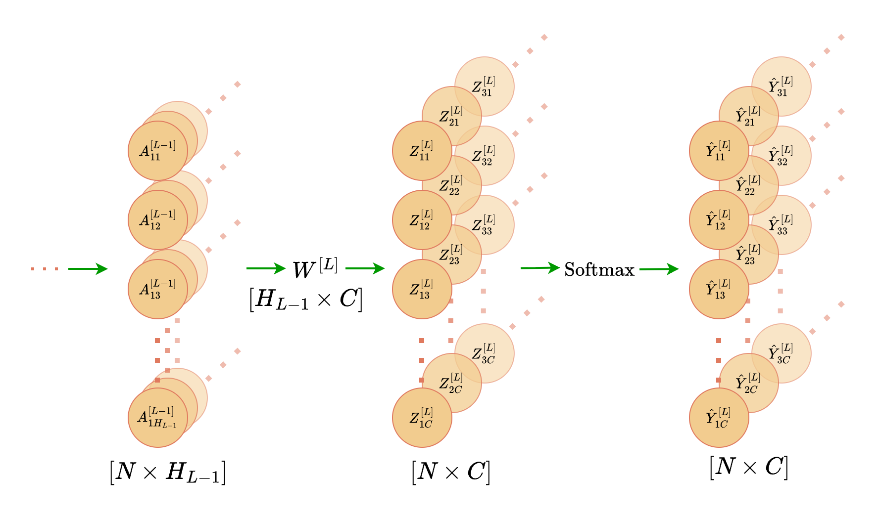 If we denote the last layer as $L$, then the model’s output for $N$ inputs and $C$ classes can be represented as follows: