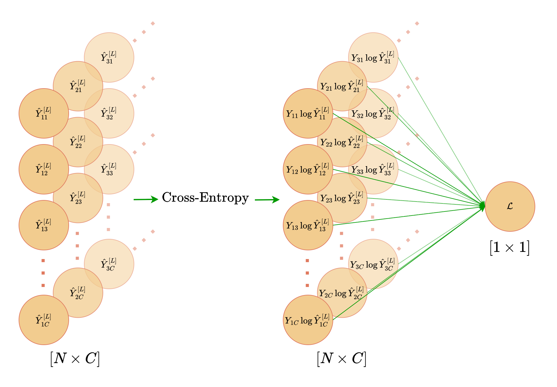 $$ \mathcal{L} = \small -\frac{1}{N} \ \text{sum}\left(\begin{bmatrix} Y_{11}\log\hat{Y}_{11} & Y_{12}\log\hat{Y}_{12} & \dots & Y_{1C}\log\hat{Y}_{1C} \\ Y_{21}\log\hat{Y}_{21} & Y_{22}\log\hat{Y}_{22} & \dots & Y_{2C}\log\hat{Y}_{2C} \\ \vdots & \vdots & \ddots & \vdots \\ Y_{N1}\log\hat{Y}_{N1} & Y_{N2}\log\hat{Y}_{N2} & \dots & Y_{NC}\log\hat{Y}_{NC} \\ \end{bmatrix}\right) $$