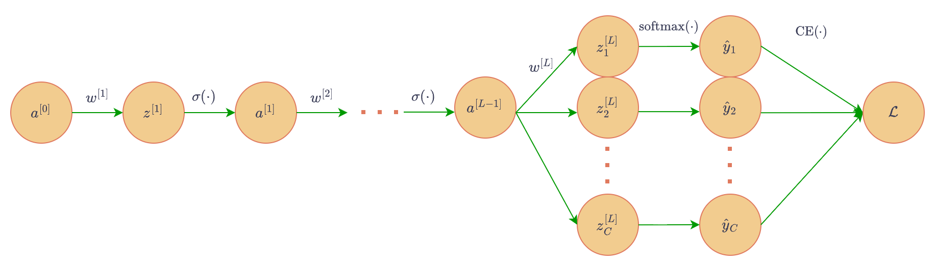 $$ \begin{array}{rcl} a^{[0]} & = & x \\ \\ z^{[1]} & = & a^{[0]} \cdot w^{[1]} & \\ a^{[1]} & = & \sigma(z^{[1]}) \\ \\ z^{[2]} & = & a^{[1]} \cdot w^{[2]} & \\ a^{[2]} & = & \sigma(z^{[2]}) \\ \\ \vdots \\ \\ z^{[l]} & = & a^{[l-1]} \cdot w^{[l]} & \\ a^{[l]} & = & \sigma(z^{[l]}) \\ \\ \vdots \\ \\ z^{[L-1]} & = & a^{[L-2]} \cdot w^{[L-1]} & \\ a^{[L-1]} & = & \sigma(z^{[L-1]}) \\ \\ z^{[L]} & = & a^{[L-1]} \cdot w^{[L]} & \\ \hat{y} & = & \text{softmax}(z^{[L]}) \\ \mathcal{L} & = & \text{CE}(\hat{y}) & = -\sum^{C}_{i=1} y_i \log \hat{y}_i \end{array} $$