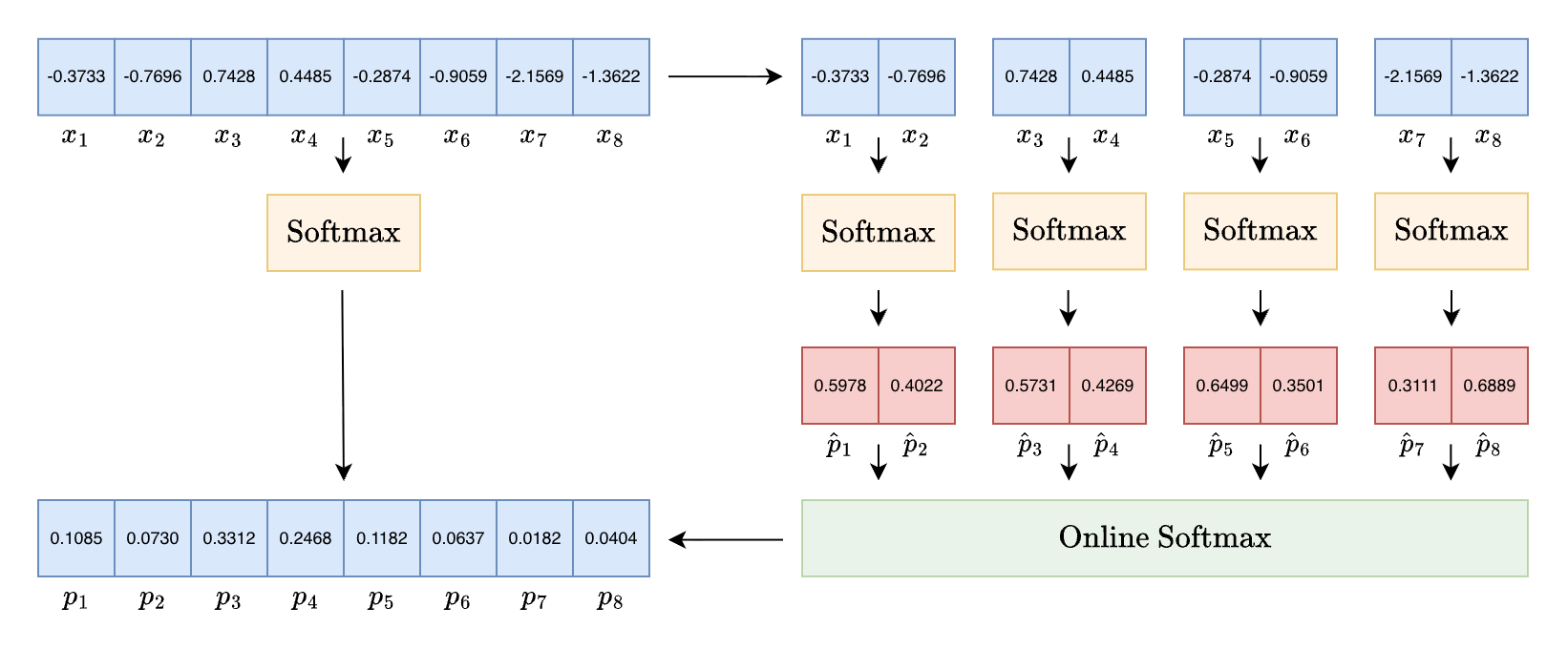 $$ \begin{align*} \text{OnlineSoftmax}(p_i, \text{lse}_i) &= p_i \cdot \frac{1}{1 + \exp(\text{lse}_{1-i} - \text{lse}_i)} \quad\quad\quad \left(i\in \{0,1\} \right) \\ \end{align*} $$